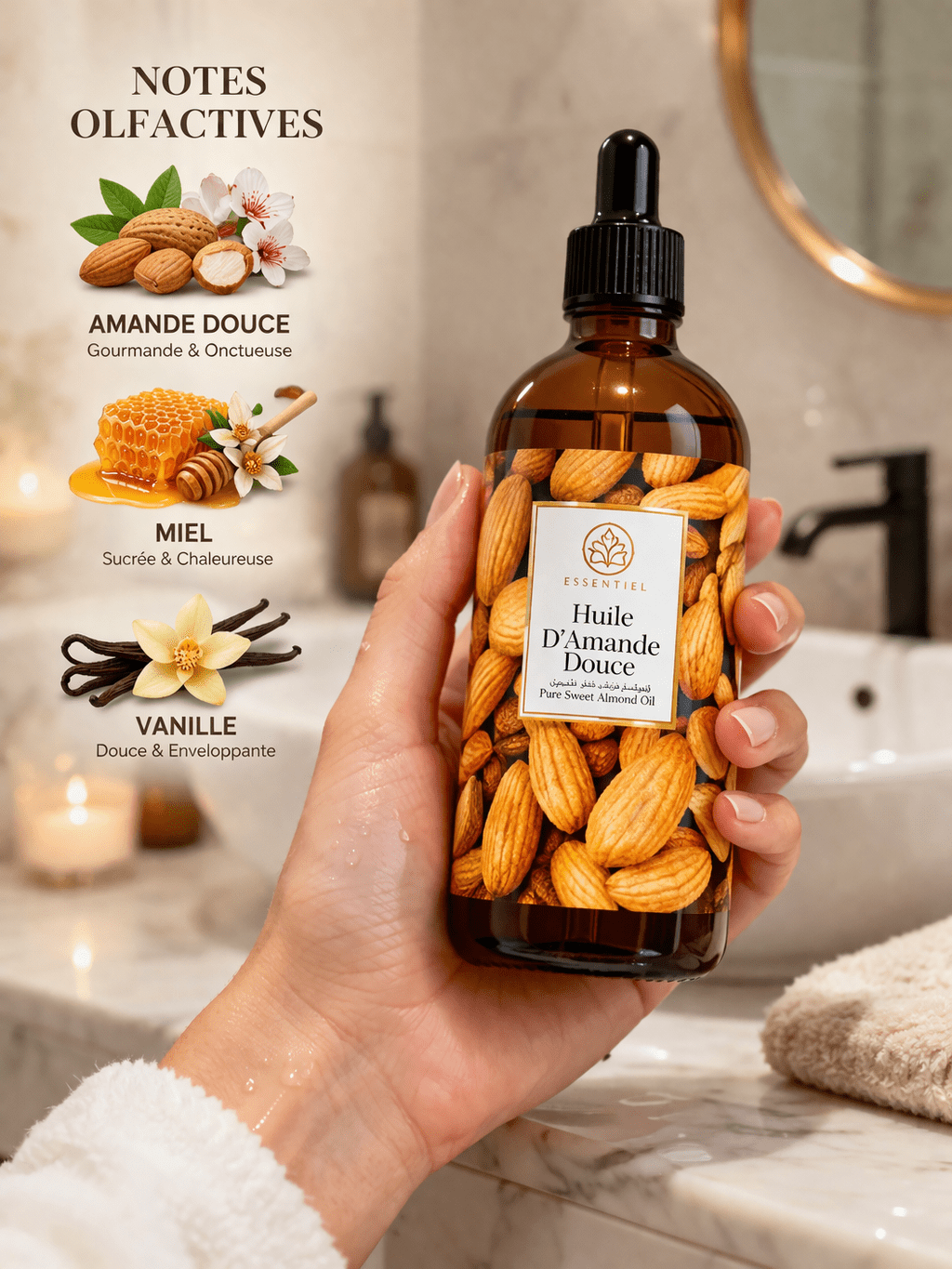 Huile d’amande douce 100% pure obtenue par pression à froid. Riche en vitamine E et acides gras essentiels, elle nourrit, adoucit et protège les peaux sèches et sensibles. Idéale pour le corps, le visage et les cheveux, pour une hydratation naturelle