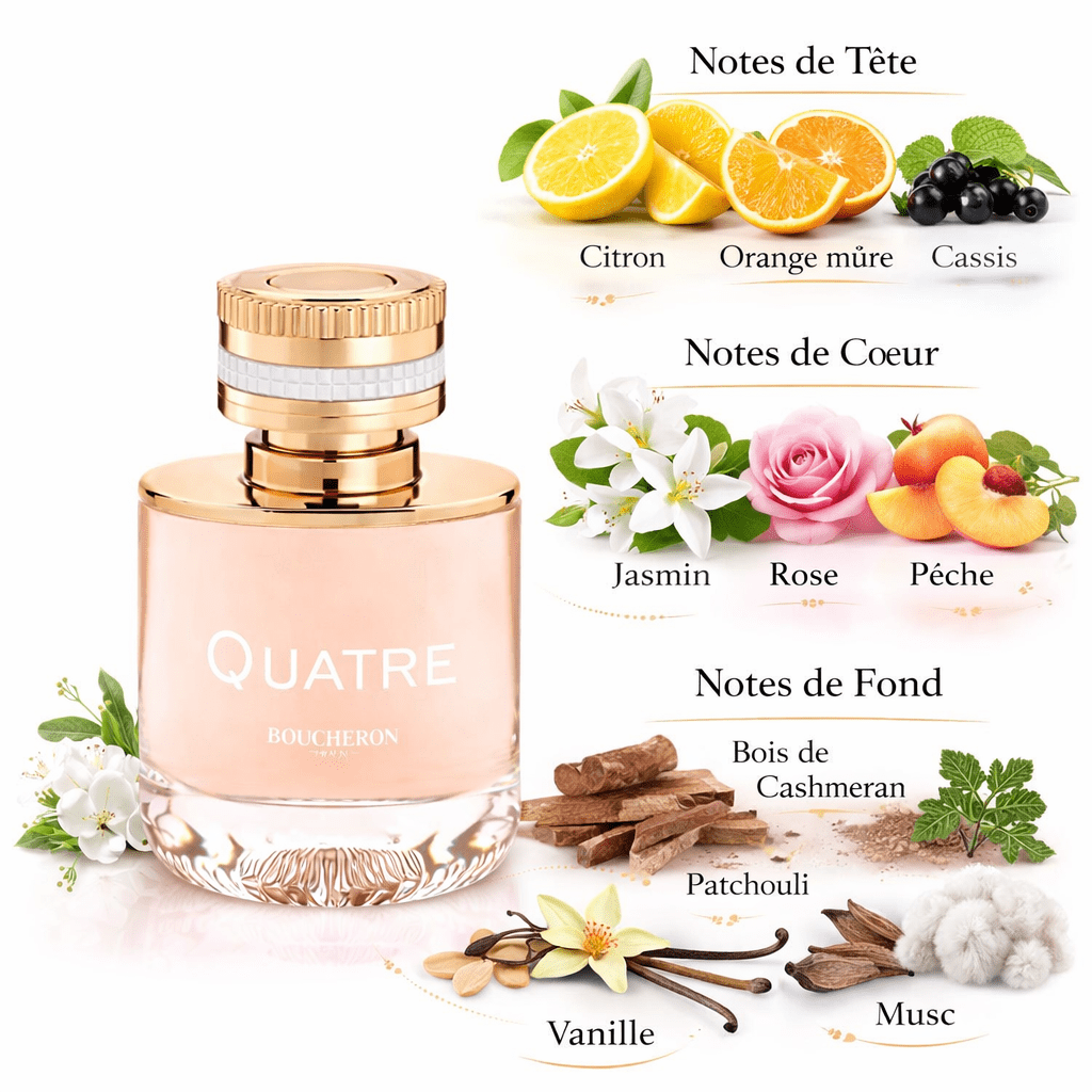 Quatre de Boucheron est une eau de parfum florale et fruitée, élégante et lumineuse. Ses notes d’agrumes pétillants, de jasmin et de rose s’accordent à un fond boisé et musqué pour un sillage raffiné, moderne et féminin.