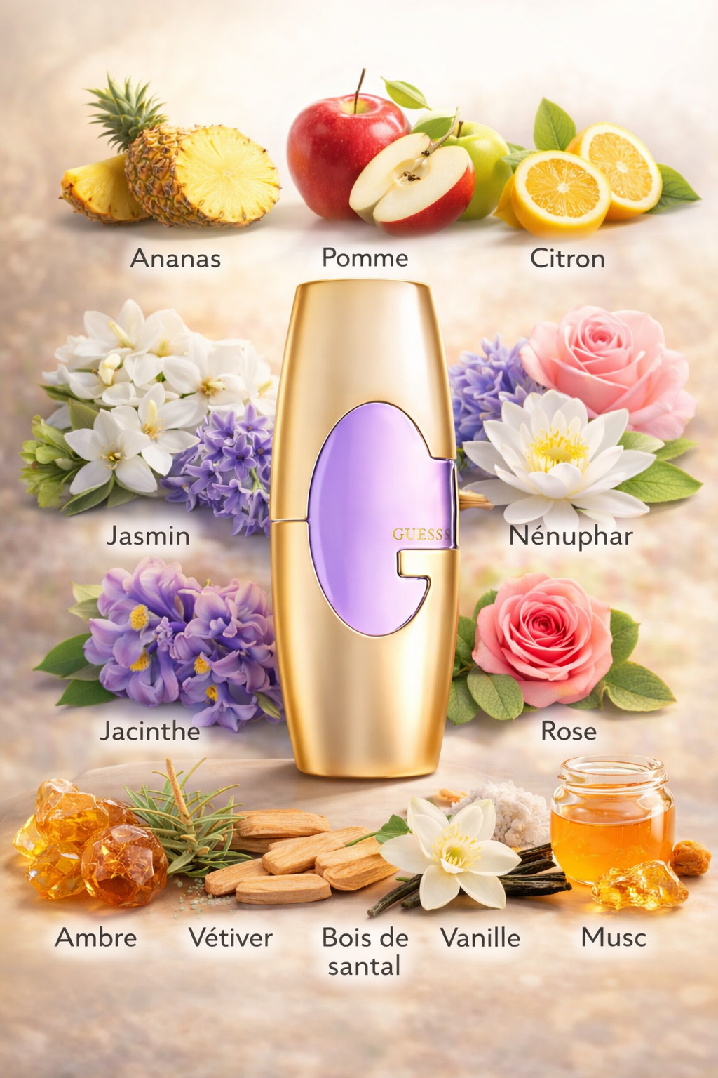 Le Guess Gold EDP 75 ml est un parfum femme oriental fruité qui allie fraîcheur, élégance et sensualité. Avec ses notes supérieures d’agrumes, de pomme et d’ananas, son cœur floral d’hyacinthe, de jasmin, de nénuphar et de rose, ainsi que sa base chaleureuse d’ambre, vétiver et bois de santal, cette fragrance offre une expérience olfactive complète et raffinée.
