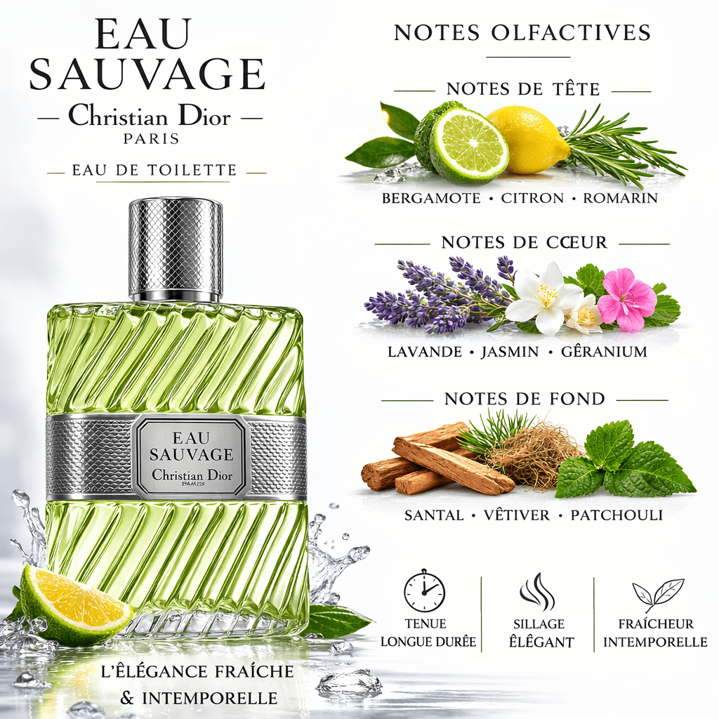 Dior Eau Sauvage Eau de Toilette est une fragrance masculine emblématique, fraîche et élégante. Ses notes hespéridées vibrantes se mêlent à un cœur aromatique et un fond boisé raffiné, offrant un sillage intemporel, chic et parfaitement équilibré.